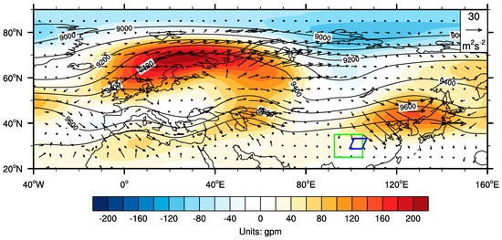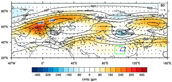 The 300 hPa geopotential height (contour, CI = 100 gpm), geopotential height anomalies (shading, SI = 20 gpm), and the associated wave activity flux [35] (vector, unit: m2 s−2) in July 2018. The blue parallelogram and the green rectangle are the same as those in Figure 3.