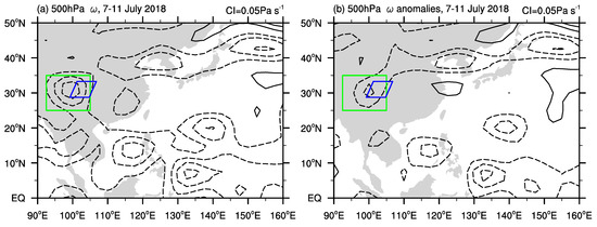 The (a) 500 hPa omega (CI = 0.05 Pa s−1) and (b) anomalies of 500 hPa omega (CI = 0.05 Pa s−1) averaged over 7–11 July 2018. The blue parallelogram and the green rectangle are the same as those in Figure 3.