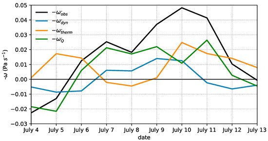 Time series of the observed 500 hPa omega anomalies (, black line), the 500 hPa omega anomalies induced by the differential vorticity advection (, blue line), the temperature advection (, orange line), and the diabatic heating (, green line) averaged over the region surrounding the Sichuan Basin (green rectangle in Figure 5) during the period 4–13 July 2018. Note that −1 was multiplied to omega anomalies for visual purposes.