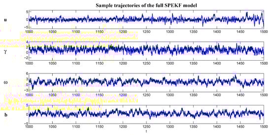 The model in (35) is the so-called Stochastic Parameterized Extended Kalman Filter (SPEKF) model [32,80] that was introduced to filter and predict the highly nonlinear and intermittent turbulent signals as observed in nature. In the SPEKF model (35), the process is driven by the stochastic damping , stochastic phase , and stochastic forcing correction , all of which are specified as Ornstein–Uhlenbeck (OU) processes [53]. In (35), is a deterministic large-scale forcing, representing external effects such as the seasonal cycle. Physically, the variable in (35) represents one of the resolved modes (i.e., observable) in the turbulent signal, while , and are hidden processes. In particular, , and are surrogates for the nonlinear interaction between and other unobserved modes in the perfect model.