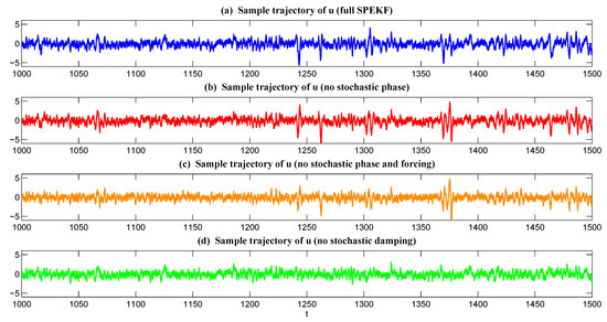 Below, the information-theoretic framework (9) is utilized to study the model reduction. In the SPEKF model (35), the three stochastic parameterized variables , , and b are typically hidden and unresolved. It is important to see whether these processes are essential in contributing to the statistical and dynamical behavior of the observed variable u in the dynamical regime with the parameters in (36).