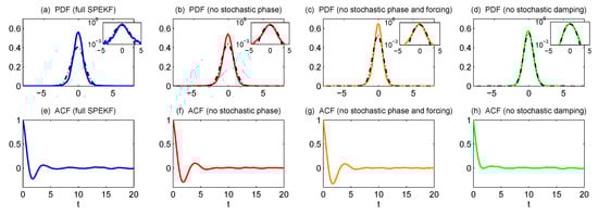 PDFs and the autocorrelation functions of the real part of u in the full SPEKF model (a), in the reduced model with (b), in the reduced model with and (c), and in the reduced model with . The subpanels in (a–d) are the PDFs shown in logarithm scales.