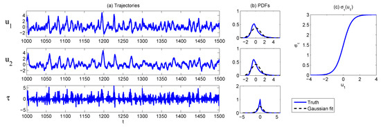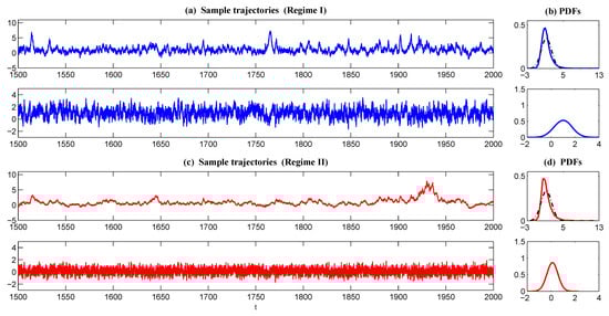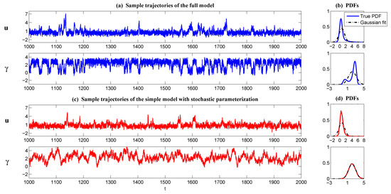 where u can be regarded as a large-scale variable, while is an unresolved variable that interacts with u in a nonlinear way. Here, the process of is given by a highly nonlinear equation, which is a canonical model for low frequency atmospheric variability and was derived based on stochastic mode reduction strategies. This one-dimensional, normal form was applied in a regression strategy in [85,86] for data from a prototype AOSmodel [87] to build one-dimensional stochastic models for low-frequency patterns such as the North Atlantic Oscillation (NAO) and the leading Principal Component (PC-1) that has features of the Arctic Oscillation. Note that the scalar model of has both correlated additive and multiplicative noise , as well as an extra uncorrelated additive noise . The nonlinearity interacting with noise allows rich dynamical features in the model such as strongly-non-Gaussian PDFs and multiple attractors.