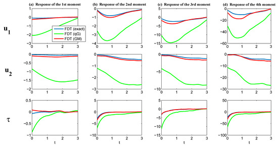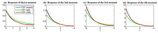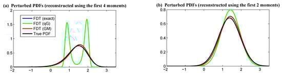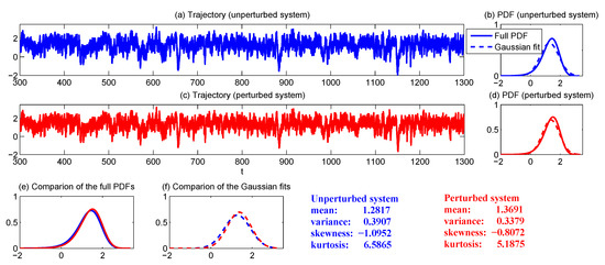 As discussed in Section 3, one of the central difficulties in calculating the linear response operator (24) lies in obtaining the unperturbed PDF , which requires solving the Fokker–Planck equation associated with the complex turbulent dynamical system (10). This is often quite difficult in practice due to the curse of dimensionality in solving the high dimensional Fokker–Planck equation. On the other hand, applying the qG FDT may lead to some bias, especially in the presence of intermittency, extreme events, and other strong non-Gaussian features, which are frequently observed in the observational data of temperature, wind and rainfall, etc. [58,59]. In fact, it has been shown in [14] using simple non-Gaussian models mimicking the atmosphere behavior in some realistic regimes that the qG FDT fails to capture the correct response.