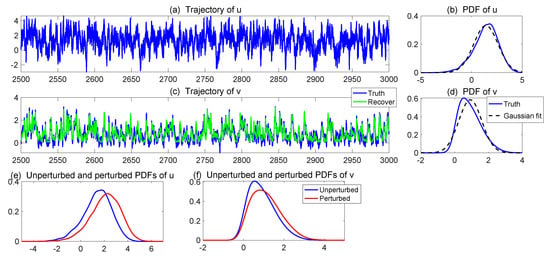 where denotes any nonlinear function of . In (10), is the state variables, is the noise matrix, and is the white noise. The evolution of the PDF associated with is driven by the so-called Fokker–Planck equation [53,54],