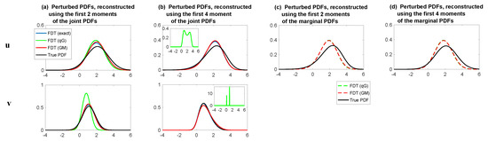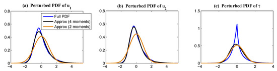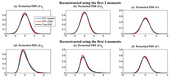 where and denote the variable u at time instants and ; represents the variance of u; and denotes the complex conjugate of u. Clearly, a linear Gaussian process is completely determined by its mean and autocorrelation function, where the autocorrelation function characterizes the memory of the system. Note that for a strongly-non-Gaussian system, the autocorrelation function is not able to describe the entire temporal information since it only makes use of the information up to the second order statistics. In such a scenario, studying the discrepancy in the autocorrelation functions of the perfect and imperfect models can be regarded as an analog of the Gaussian approximation of (2) in the temporal direction. Note that obtaining the temporal information for the underlying dynamics in complex turbulent dynamical systems is usually more difficult than that for the equilibrium statistics. Therefore, the simple approach of using the autocorrelation functions, despite its potential biases in strongly-non-Gaussian systems, is often a practically useful strategy. Calibrating both the equilibrium PDF and the autocorrelation functions in imperfect models for prediction was a strategy used in [19,22].
