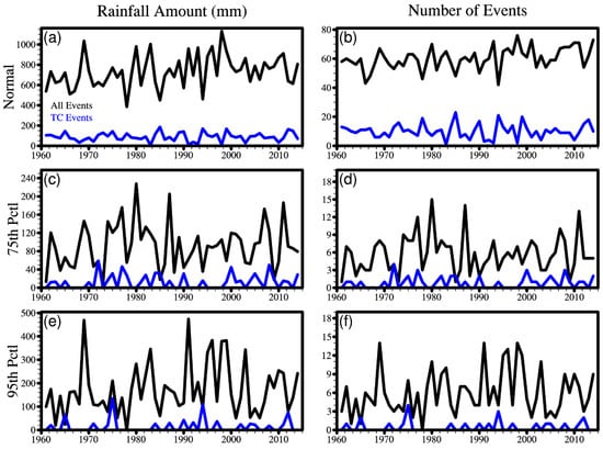 We adopt three metrics of rainfall regimes to analyze in-depth the contribution of TCs to precipitation events in MLYRB (Figure 1). Normal rainfall events are defined with the daily precipitation being greater than or equal to 1 mm, but excluding the other two kinds of short-lived precipitation extremes at the 75th and 95th percentile cases. Based on these definitions, the number of precipitation events over MLYRB caused by TCs in summer from 1961 to 2014 is 546, 44, and 24 for the normal, 75th, and 95th percentile precipitation events, respectively. In general, the proportional contributions of the frequency of TC-induced rainfall to the number of total precipitation events are not apparent, with the strongest contribution up to 14.4% for normal rainfall events, and fewer extreme precipitation events originate from TCs. The rainfall amount of normal events is roughly 2–3 times that of the 75th and 95th percentile cases (black lines in Figure 1a,c,e). While the rainfall accumulation of TC-induced events also exhibits distinct discrepancies among three defined precipitation regimes (blue lines in Figure 1a,c,e). A similar phenomenon is also recorded for the time series of number of precipitation events (Figure 1b,d,f).