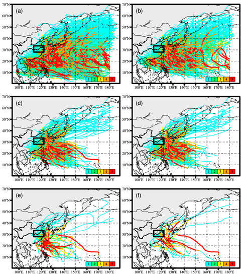The observational TC tracks between 1961 and 2014. The color scales denote Saffir–Simpson hurricane wind scales. (a) All the annual TC tracks. (b) Summertime TC tracks. (c) All TC tracks that induce precipitation in summer. (d) The TC tracks that induce normal rainfall events in summer. (e,f) The TC tracks that induce 75th and 95th percentile precipitation events, respectively. The black rectangle denotes the middle–lower reaches of Yangtze River Basin (MLYRB) within the region 28°–33.5° N, 113°–122° E.