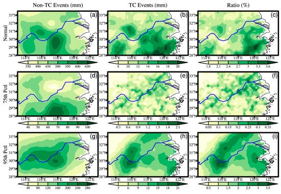 The spatial distribution of annual total TC tracks indicates that MLYRB is not the most affected region by TCs in China; consistent findings are also reported by Li and Zhou [] and Li et al. [], who pointed out that in TC-affected regions the contribution of TC-related precipitation to total rainfall reaches up to 50%, and was chiefly distributed in southeast coastal regions and Hainan, rather than concentrated across MLYRB. Furthermore, the considerable proportion of TCs originated from WNP cannot trigger rainfall events over MLYRB in summer, as their tracks are mainly limited over WNP and they do not make landfall across MLYRB (Figure 2b,c). There are more strengthened landfalling TCs passing through the MLYRB at the both 75th and 95th percentile events compared to that for normal rainfall events (Figure 2d–f). These TCs tracks exert a control on the spatial distribution of the contributions of TC-induced precipitation to summer total rainfall over MLYRB (Figure 3). The distribution of summer mean normal TC-induced rainfall suggests that the highest precipitation amount in excess of 20 mm are mainly found over central, southwest and southeast MLYRB, which is not consistent with corresponding non-TC events with larger rainfall totals exceeding 600 mm situated over central and southwest (Figure 3a,b). For TC-induced precipitation, the highest proportions are recorded along southeast coastal regions of MLYRB (Figure 3c). It is worth noting that the similar relative TC-induced contributions are found at the 95th percentile precipitation events, while the spatial distribution of higher TC-induced rainfall proportions exhibits remarkable discrepancies between normal rainfall events and 95th percentile cases (Figure 3c,i). Moreover, the distribution of TC-induced contributions at the 95th percentile rainfall events roughly coincides with that of mean TC-induced precipitation in summer. However, both of the summer TC-induced rainfall accumulation and proportions for 75th percentile events are much smaller compared to normal and 95th percentile precipitation events, suggesting that TCs may have stronger influences on the lower and upper tail of precipitation distribution than on the moderate rainfall events (75th percentile events).