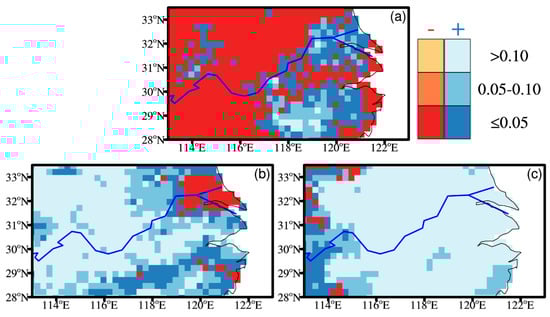 Since a large number of studies have indicated that the TC activities are modulated by different phases of ENSO episodes (e.g., Camargo et al., 2007; Colbert et al., 2015; Khouakhi et al., 2017; Zhang et al., 2018 [,,,]). To examine the relationship between ESNO and TC-induced precipitation events comprehensively, we focus on three seasonal Niño-3.4 indices during summer, spring (March–May (MAM)), and the preceding winter (December, January, and February (DJF)) for analyzing the influences of ENSO on TC-induced rainfall over MLYRB. Figure 4 summarizes the outcomes from Poisson regression exhibiting the role of ENSO to occurrence of the TC-induced precipitation events at different levels of significance, in which we focus on summer Niño-3.4 index. Each grid shows the estimated value of the coefficient derived from Poisson regression (Equation (2)); negative values (red) denote a greater probability of the TC-induced rainfall events during negative phase of ENSO, conversely, positive values (blue) denote a greater probability of the events during positive phase of ENSO. Figure 4a highlights the spatial geographical difference of the relationship between normal TC-induced rainfall events and ENSO, with normal events occurring in different ENSO phases. Particularly, the spatially coherent negative signals, with significance at 5% and 10% levels, are found over central-west MLYRB and the majority of northern areas, suggesting that normal TC-induced rainfall events occur with a greater probability during negative ENSO phase. On the contrary, over southeast and northeast MLYRB we found a positive connection with ENSO with significance at 5% and 10% levels, indicating that the normal TC-induced rainfall events are more likely during positive phases of ENSO. Overall, the impact of negative ENSO phases is more significant over the majority of regions across MLYRB. However, spatially coherent positive signals are dominated over most of areas for 75th and 95th percentile precipitation events, even though not exceeding the 95% confidence level (Figure 4b,c), there are also suggestions indicating that we may generally expect more TC-induced short-lived extreme precipitation events during positive ENSO phases. Only few gridded sites located northeast and southeast show negative values of the coefficient for 75th percentile events, where the short-lived precipitation extremes are generally tied to occurrence of the WNP TCs during negative phases of ENSO. For the 95th percentile cases, very few gridded sites with negative coefficient are sporadically distributed in northwest MLYRB, implying a higher likelihood of short-lived extreme precipitation events caused by TCs during negative ENSO phases. The above analyses suggest that there are remarkable discrepancies between the impacts of ENSO on normal rainfall events and short-lived precipitation extremes caused by TCs over MLYRB in summer, we expect a greater probability of occurrence of normal (extreme) short-lived rainfall events associated with WNP TCs during negative (positive) phases of ENSO.