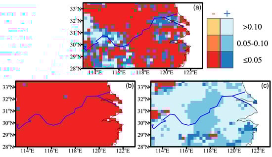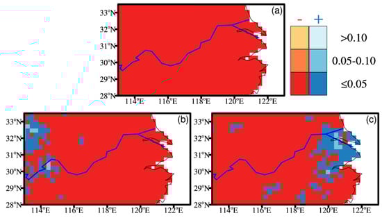 Relationship between summertime precipitation events associated with tropical cyclones (TCs) and El Niño–Southern Oscillation (ENSO), regression coefficients derived from Poisson regression display at different level of significance. (a) Normal rainfall events. (b) 75th percentile precipitation events. (c) 95th percentile precipitation events. The bold blue curve denotes the Yangtze River.