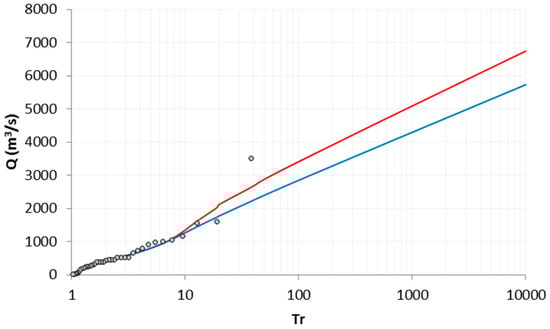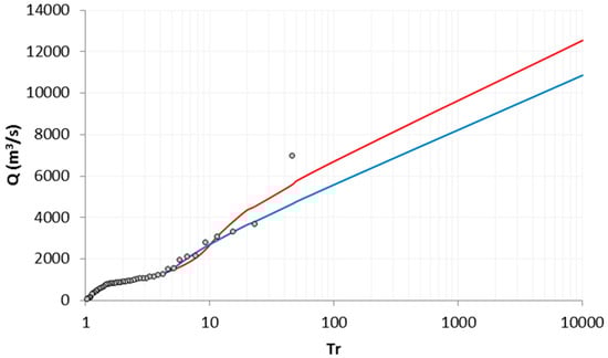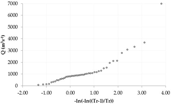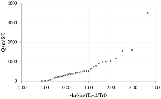Subsequently, the Q register was ordered in a decreasing way, assigning to each annual flow a period of return in accordance with the expression proposed by Weibull (Equation (13)) [41], as widely used by countries such as Mexico, and Central and South America. This allowed the sample data to be plotted with respect to the reduced variable −ln (−ln ((Tr − 1)/Tr)), and observing segments with different linear tendencies in the traced behavior (Figure 2 and Figure 3).