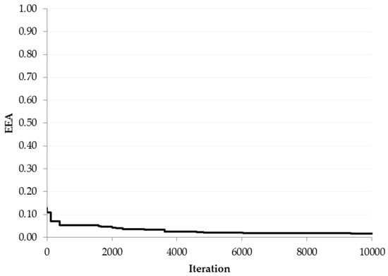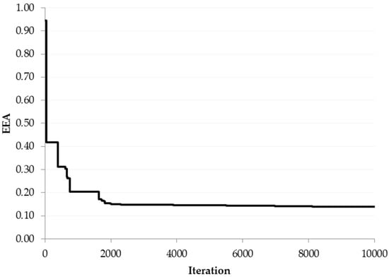 At the beginning of the optimization process, minimal iterations were required to reduce the EEA value to 0.41. The number of iterations was reduced to 2000 and finally, this is the value of the final solution. This behavior reaffirms the efficiency of the meta-heuristic technique for minimizing the objective function (Equation (14)).