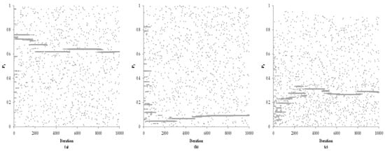 Behavior of the probability parameter for the EV1-3P with respect to the iterations of (a) P1; (b) P2; and (c) P3 for hydrometric station 10040.