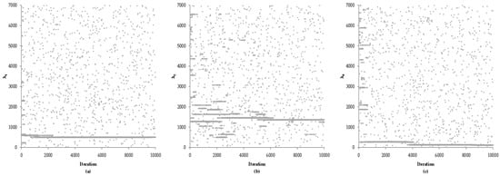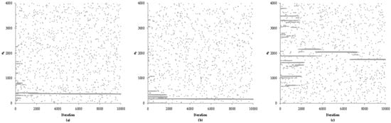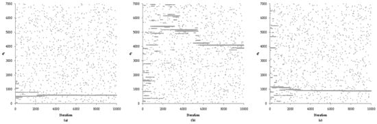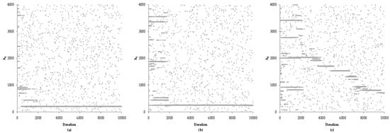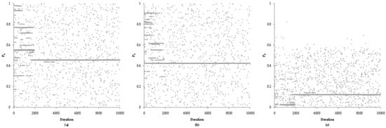 Behavior of the scale parameters for the EV1-3P with respect to the iterations of (a) λ1; (b) λ2; and (c) λ3 for hydrometric station 10040.