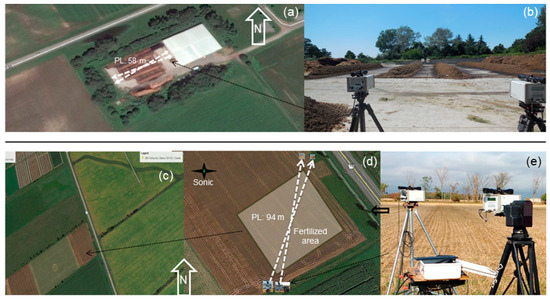 Site configuration with sensor positions. (a) Compost site overview, (b) lasers, reflectors and compost piles. (c) Wheat stubble field overview, (d) approximate positions of lasers, reflectors and sonic anemometer, and (e) photo of the lasers.