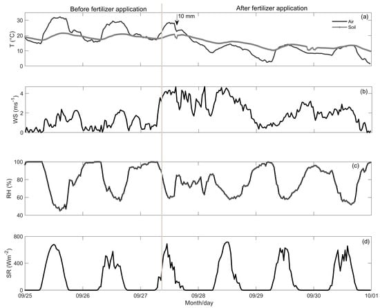 Hourly averages of (a) air temperature (black) and soil temperature (gray), (b) wind speed, (c) relative humidity, and (d) solar radiation measured during the field trial. Fertilization occurred at 09:30 on 27 September (vertical line). A rain storm occurred six hours after fertilization.