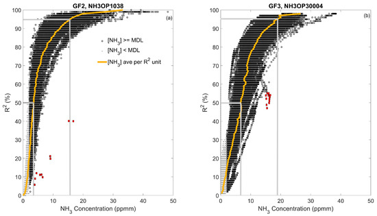 Raw NH3 concentration (ppmm) versus R2 (%) from GasFinder2 NH3-OP1038 (a) and GasFinder3 NH3-OP30004 (b) during measurements at the composting facility. The path lengths were 58 m. Yellow lines indicate the averaged ppmm value for each R2 interval. Gray droplines show R2 = 50 and 95%. Each point represents 1–2 seconds. Symbols indicate data that were filtered out below the minimum detection limit (MDL) (×) and manually removed (■).