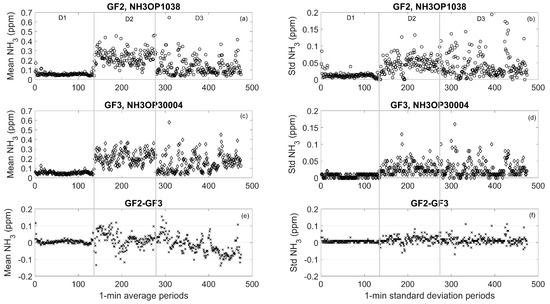 NH3 concentration measured during three days at the composting facility. (a, c) Averaged NH3 concentration means within 1 min periods of GF2 and GF3; (e) difference of averaged means of GF2–GF3; (b, d) averaged standard deviations within 1 min periods of GF2 and GF3; (f) difference of averaged standard deviations of GF2–GF3.
