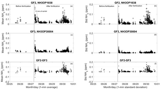 Means (a, c, e) and standard deviations (b, d, f) on a 1 min period basis of NH3 concentrations measured by the GF2 (NH3-OP1038) and GF3 (NH3-OP30004) at the field trial two days before fertilization and four days during and after fertilizer application. The data shown have not been filtered based on atmospheric turbulence conditions.