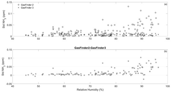 (a) Standard deviations on a 30 min period basis of NH3 concentrations measured by the GF2 and GF3 versus relative humidity measured from the on-site weather station at the field trial before fertilization and after fertilizer application. (b) Differences in standard deviations of NH3 concentrations between GF2 and GF3 versus relative humidity.