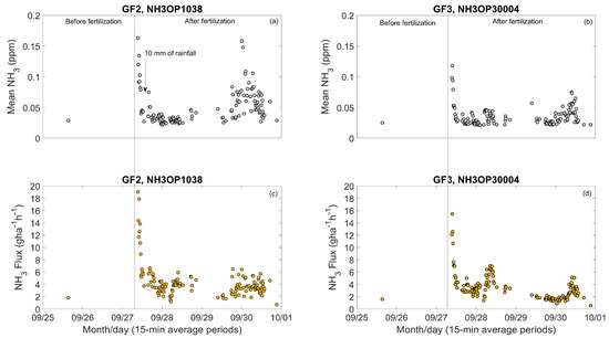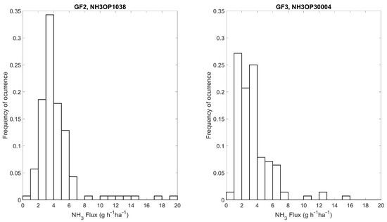 After fertilizer application, NH3 concentrations increased (Figure 7a,b), and fluxes increased to a maximum of 19.1 g ha−1 h−1 for the GF2 and 15.5 g ha−1 h−1 for the GF3 on a 15 min basis (Figure 7c,d). Soon after fertilization, however, those fluxes decreased rapidly, with most fluxes being under 8 g ha−1 h−1 (Figure 8). This was likely due to the application method (surface), the low rate of fertilizer applied, and the heavy rainfall. Despite the severe weather conditions (wind gusting up to 25 m s−1), all sensors remained operational during and after the storm.