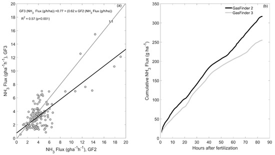 After fertilizer application (over about 88 h), NH3 fluxes measured using the two lasers showed a significant correlation (p < 0.001), although the relationship was not one-to-one (Figure 9a). On average, NH3 emissions rates after fertilizer application were about 25% higher for the GF2 than the GF3 (Table 2). The difference between GF3 and GF2 was largest on the third day after application (night of 29 to 30 September; Figure 7c,d). Cumulative NH3 losses measured by the GF2 and GF3 were 317 and 255 g NH3 ha−1, respectively (Figure 9b). It is noteworthy that these are quite low agricultural emission rates. For comparison, fluxes over 100 g NH3-N ha−1 h−1 and cumulative emissions over 10 kg N ha−1 were reported in a field study with urea [7]. The fact that both lasers gave cumulative emissions within 62 g ha−1 despite the low emission rates demonstrates the level of repeatability when using these open path lasers combined with the bLS technique to determine NH3 emissions from agricultural systems.