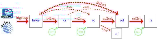 In the infrared and microwave region, line-by-line (lbl) modeling of molecular absorption is mandatory esp. for high spectral resolution. Furthermore, lbl models are required for the setup and verification of fast parameterized models, e.g., band, k-distribution, or exponential sum fitting models [6,9,10]. Moreover, lbl models are ideal for radiative transfer in planetary atmospheres, where fast models often parameterized for Earth-like conditions are not suitable [11,12].