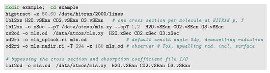 A typical session in a Unix/Linux environment (console/terminal) is shown in Figure 2. After creating a new directory, the first step is to extract the relevant lines from the HITRAN or GEISA data base using higstract. (Data are available at hitran.org and http://cds-espri.ipsl.upmc.fr/. Py4CAtS can read the original data file as is, i.e., the 160-byte fixed-width format used since HITRAN 2004 or the 100-byte format of the older HITRAN versions. Regarding GEISA, the format of a single record (corresponding to a “physical line”) has changed slightly from version to version, and Py4CAtS parses the file name to select the appropriate reader.) Please note that for this command at least one option is mandatory, i.e., the spectral range (here 50 to ) or a molecule must be specified (for convenience, higstract -m main … can be used to extract line data for the first seven molecules (, , …, ) of HITRAN or GEISA.) higstract saves the data in several tabular ASCII files, one file per molecule. By default, each file has five columns for line position , strengths S, energy E, air-broadening parameter , and the exponent n and is named as H2O.vSEan etc., where the extension indicates the columns (further parameters, e.g., for self-broadening, can be requested with the format option -f).