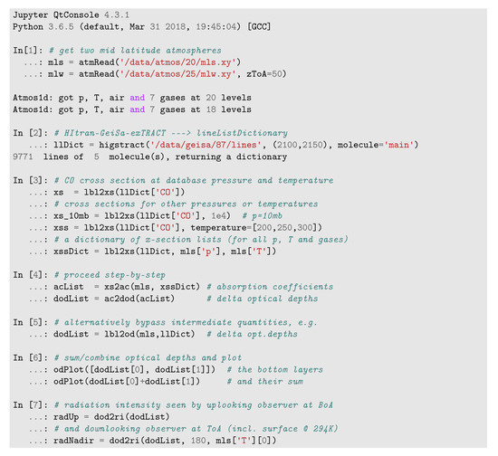 In general, RTMs incl. lbl models work as a kind of “black-box”. Given a set of specifications on spectral range, atmospheric conditions, geometry etc. compiled in an input file (or configuration file etc., e.g., the TAPE5 used by LOWTRAN, MODTRAN, and FASCODE), the program is executed reading this input file (and probably some further auxiliary files, e.g., the lbl database) and one or several spectra (transmission, radiance, …) are returned (e.g., saved in file(s)). This approach is clearly advantageous when numerous transmission and/or radiance spectra must be generated, e.g., for the operational analysis of thousands or millions of observed spectra. However, to better understand the physics of radiative transfer, inspection of intermediate variables can provide useful insight. For example, the selection of an appropriate spectral range or measurement geometry is crucial for the design and setup of a new measurement system, and analysis and visualization of line parameters, absorption cross sections and coefficients, layer optical depths, etc. can be useful. Methods and tools have been developed for the “automated” definition of “microwindows”, i.e., spectral intervals optimized for retrieval of temperature or molecular concentrations from thermal emission infrared observations (e.g., [41,42,43,44,45,46]). Despite these and similar efforts interactive and flexible RTMs with an easy access to all kind of intermediate variables (“step-by-step”, similar to a debugger) appear to be useful, also for pedagogical purposes.