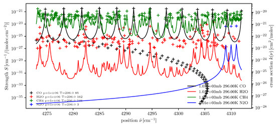 The next step is to compute absorption cross sections according to Equation (1). Without any option, cross sections are computed for the reference pressure and temperature used in the line parameter database, i.e., and for HITRAN and GEISA. Alternatively, pressure(s) and temperature(s) can be specified with the -p and -T option. For atmospheric applications it is more convenient to read the data from a file (e.g., “midlatitude summer” (mls) data assuming the first three column list altitudes, pressure, and temperature). Again, the cross sections will be saved in files, one per molecule, using NumPy’s pickle format or alternatively ASCII tabular or HITRAN formatted files.