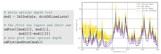 The next step is to integrate the absorption coefficients along the (vertical) path through the atmosphere using the function ac2dod (see In[4] in Figure 3). Similar to cross sections and absorption coefficients this returns a list of (nLevels-1) subclassed NumPy arrays odArray, where each list member is essentially the delta / differential / layer optical depth spectrum along with its attributes lower and upper altitudes, pressures, and temperatures (and the wavenumber interval, too).