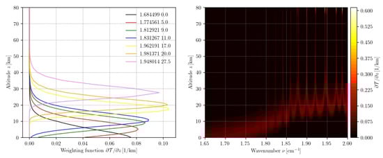 Weighting functions (wf) are an important concept for atmospheric temperature sounding and are a measure of the contribution of a particular atmospheric layer to the radiation seen by an observer, see Equation (10). They are defined by for a vertical path, or more generally