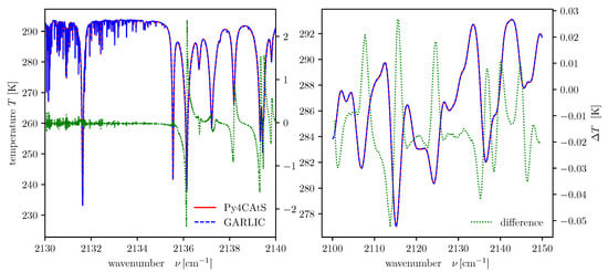 From the very beginning of the code development (MIRART, GARLIC, and Py4CAtS) numerical schemes have been used whenever possible. Hence, in contrast to most lbl radiative transfer codes dividing the atmosphere into a series of layers with constant pressure, temperature, and concentrations (Curtis-Godson approximation), Py4CAtS and GARLIC are level-based and exploit numerical quadrature for Equations (7) and (9). In particular, the optical depth is approximated by the sum of absorption coefficients according to the trapezoid rule (e.g., [66]). For the Schwarzschild equation (9) both codes use optical depth as integration variable and assume that the Planck function varies linearly or exponentially with optical depth within a layer,