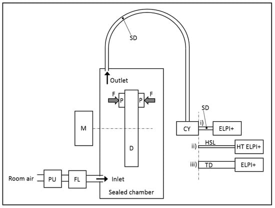 Schematic of the experimental setup. PU: pump; FL: HEPA filter; D: disc; M: motor; P: pad; F: force; SD: sampling ducts, CY: cyclone; HSL: heated sampling line; HT ELPI+: cascade impactor operating at high temperature; ELPI+: standard cascade impactor; and TD: thermodenuder.