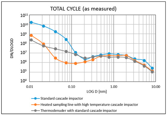 Figure 2 presents the results in terms of total concentration versus aerodynamic diameter, as measured from the used cascade impactors and corrected for the calculated losses, with both Equations (1) and (2) for the TD and with Equations (3)–(7), and the arguments of the dedicated section, for the HSL. Results showed that with a sampling line heated to 200 °C together with heated collection plates (HT ELPI+), the particle number in the size fraction below 200 nm could be reduced on the order of several decades. In general, the size distribution chart in Figure 2 could be divided into a non-volatile part above 200 nm and a semi-volatile part below 200 nm. During the test, temperatures at 171 °C and 124 °C at the inlet and at the outlet of the impactor of ELPI+ HT, respectively, were measured.