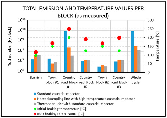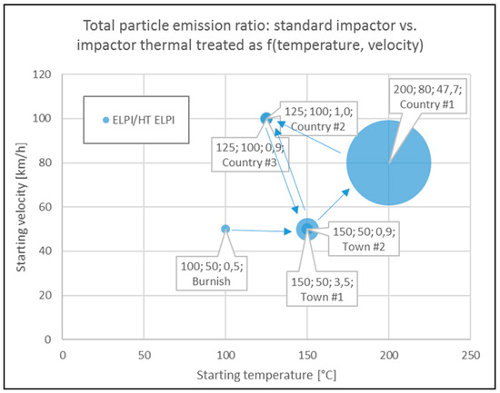 Figure 5 depicts the ratio—in terms of bubble diameter—of the total particle emission amount per block as measured for the standard cascade impactor and the one operating at high temperature. This ratio was plotted in a graph with the braking starting temperature as the x-axis versus the braking starting velocity as the y-axis. The labels associated to each block represented (i) the value of the ratio for that certain block, (ii) the braking starting temperature, (iii) the braking starting velocity, and (iv) the name of the block, while arrows between the bubbles indicated the timeline of the test cycle, also represented in Table 3. The largest ratio was ascribable to Country road block #1 (in Figure 5 assigned as Country #1).
