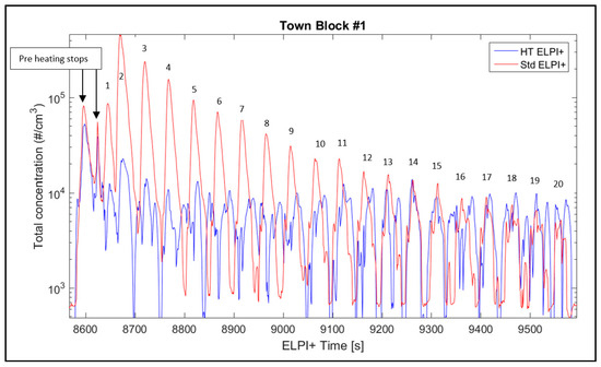 As an example, Figure 4 illustrates the instant values of the total concentration calculated for standard cascade impactor of ELPI+, and the one operating at high temperature in the case of HT ELPI+, measured for Town block #1. Note that the first two peaks were ascribed to preheating stops that were executed to heat the brake disc, while the 20 following stops were numbered in Figure 4. It was evident from Figure 4 that over time, the concentration became comparable for both detection setups (ELPI+ and HT ELPI+).