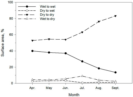 The average percentage of wetland surface area in the W→W hydrologic state decreased from April (40%) through September (14%) while the percentage of wetland surface area in the D→D hydrologic state increased from 53% to 83% (Figure 2). The percentage of W→D wetland surface area peaked in July (9%) as wetland water levels receded. The percentage of D→W wetland area was 3% from April through June and 1% from July through September (Figure 2).