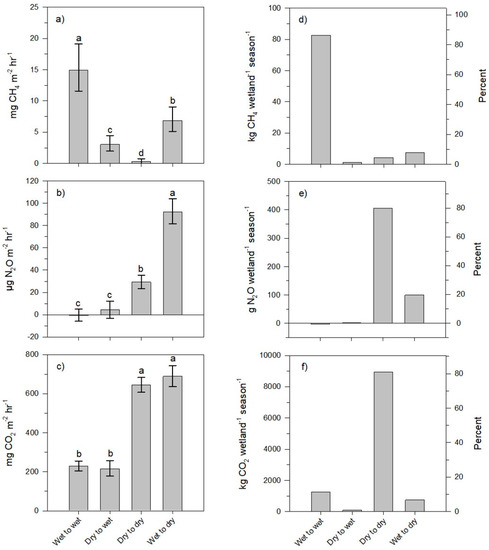 Average (least square means ± 95% confidence intervals) fluxes of (a) CH4, (b) N2O, and (c) CO2 of seasonal Prairie Pothole Region wetlands by hydrologic state. Average area-adjusted, cumulative fluxes of (d) CH4, (e) N2O, and (f) CO2 of seasonal Prairie Pothole Region wetlands by hydrologic state. For panels a–c, different letters indicate significant differences among the hydrologic states (α = 0.05).