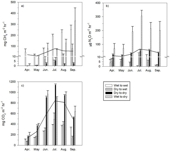 It has been well established that CH4 flux from wetlands is influenced by, among other things, soil saturation and temperature, and that seasonal flux often peaks during mid-summer when conditions are optimal for the production of CH4 [6,11,16,25,28,29]. Correspondingly, overall average monthly CH4 fluxes (solid line in Figure 4a) presented as part of this study generally increased from April through July and decreased nearly 30% from July to September (Figure 4a). These qualitative trends, which are based on average wetland fluxes for the entire wetland, suggest that CH4 production and flux decline as the season progresses and abiotic (e.g., temperature, soil moisture) and biotic (e.g., vegetation) conditions change. Yet, when CH4 fluxes are examined in relation to hydrologic state or condition, it is apparent that fluxes can remain high throughout the season in W→W, D→W, or W→D locations (Figure 4a).