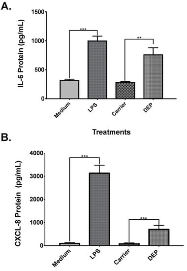 Validation of the experimental conditions. A total of 5.0 × 104 BEAS-2B cells were seeded on 96-well plates. Positive control cells were exposed to 10 µg/mL of lipopolysaccharides (LPS), negative controls cells were exposed to Keratinocyte Basal Medium-2 (KGM-2), carrier cells were exposed to 0.1% dimethyl sulfoxide (DMSO) diluted in KGM-2 and diesel exhaust particles (DEP) cells were exposed to 10 µg/mL of DEP organic extract. Interleukin-6 (IL-6) release (A) and interleukin-8 (CXCL8) release (B) were measured from cell supernatants after 24 h of exposure. Values are expressed as the mean ± SEM (n = 3). ** p ≤ 0.01 *** p ≤ 0.001 compared to negative control.