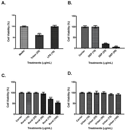 Cell viability. A total of 1.0 × 105 BEAS-2B cells were exposed for 24 h to various treatments prior determination of their viability using the Neutral Red Assay. (A). Control cells were exposed to KGM-2 media alone (Medium), 25 µg/mL of TRITON X-100, and 10 µg/mL LPS. (B). Cells were exposed to 0.1% of DMSO diluted in media (carrier) and increasing concentrations of DEP organic extract. (C). Cells were exposed to different concentrations of the rural airborne particulate matter (PM) organic extract. (D). Cells were exposed to different concentrations of the urban PM organic extracts. Values are expressed as the mean ± SEM (n = 3), *** p ≤ 0.001 compared to media and to carrier (controls), when exposed to DEP organic extract, Rural PM organic extract, and Urban PM organic extract.