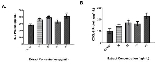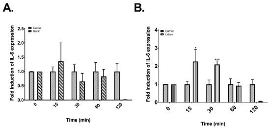 Dose response of rural organic extract. A total of 5.0 × 104 BEAS-2B cells were seeded on 96-well plates and exposed to increasing concentrations of the rural PM organic extract. IL-6 (A) and CXCL8 (B) protein levels were measured from cell supernatants after 24 h of exposure. Values are expressed as the mean ± SEM (n = 3). * p ≤ 0.05, ** p ≤ 0.01 compared to carrier.