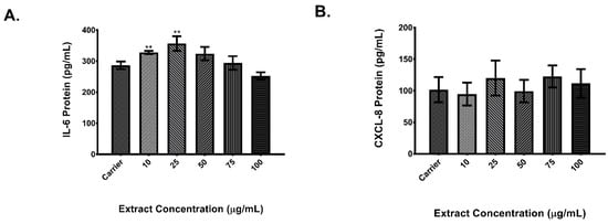 Dose response of urban organic extract. A total of 5.0 × 104 BEAS-2B cells were seeded on 96-well plates and exposed to increasing concentrations of the urban PM organic extract. IL-6 (A) and CXCL8 (B) protein levels were measured from cell supernatants after 24 h of exposure. Values are expressed as the mean ± SEM (n = 3). ** p ≤ 0.01 compared to carrier.