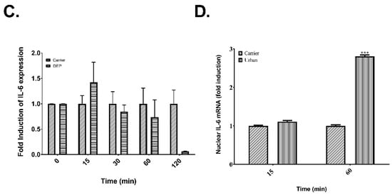 Post-transcriptional control and nuclear expression of IL-6 in cells exposed to rural and urban organic extracts from PR and DEP organic extract. (A) Time course of cells exposed to 25 μg/mL of rural organic extract. (B) Time course of cells exposed to 25 μg/mL of urban organic extract. (C) Time course of cells exposed to 10 μg/mL of DEP organic extract. (D) Induction of the transcription rate of IL-6 transcript in response to urban organic extract exposure. Values are expressed as the mean ± SEM (n = 3). * p ≤ 0.05, *** p ≤ 0.001 compared to carrier.