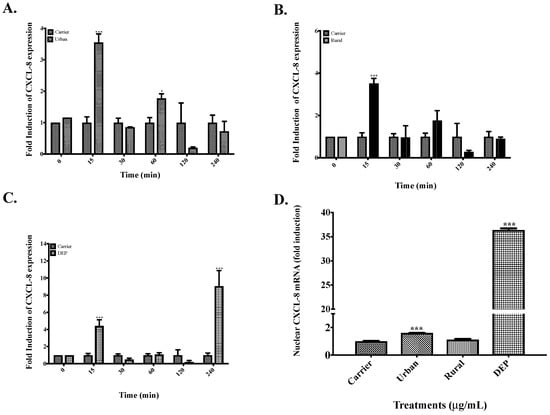 Post-transcriptional control and nuclear expression of CXCL8 in cells exposed to organic extracts from rural PM2.5, urban PM2.5 and DEP. (A) Time course of cells exposed to 25 μg/mL of urban extract. (B) Time-course of cells exposed to 25 μg/mL of rural extract. (C) Time course of cells exposed to 10 μg/mL of DEP extract. (D) Induction of the transcription rate of CXCL8 transcript after 15 min of exposure to rural, urban, and DEP organic extracts. Values are expressed as the mean ± SEM (n = 3). * p ≤ 0.05, *** p ≤ 0.001 compared to carrier.