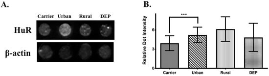 HuR was measured in the cytoplasm because is well known that changes in the post-transcriptional control of IL-6 and CXCL8 have been associated with the presence of AREs in the 3’UTR region of their mRNAs. These changes result from the activation, and thus cytoplasmic translocation of different AREBPs. HuR is one of the most studied AREBP, and is known that once activated, this protein shuttles to the cytoplasm and stabilized ARE-mRNAs []. In order to explore if the activation of HuR is associated with the stabilization of IL-6 and CXCL8 induced by the urban and rural extracts dot blots were performed to determine if there are a cytoplasmic abundance of HuR in exposed cells. BEAS-2B were seeded onto 24-well plates (5.0 × 105 cells/well) and exposed to 10 µg/mL of DEP extract, and 25 µg/mL of the urban and rural PM organic extracts for 15 min and 60 min. Cytoplasmic proteins were extracted using the method of Lahiri et al., [] with the following modifications. Briefly, BEAS-2B cells were washed with 300 µL of TBS and then incubated for 15 min with 400 µL ice-cold buffer (10 mM HEPES pH 7.9, 10 mM KCl, 0.1 mM EDTA, 0.1 mM EGTA, 1 mM DTT, 0.5 mM PMSF, and 2 µL Complete Protease Inhibitor cocktail). Cells were scraped from the plate and transferred to a new tube followed by the addition of 25 µL of Triton X-100. Cell homogenates were centrifuged for 5 min at 1500× g at 4 °C and supernatants containing the cytoplasmic fraction were collected. Protein concentrations were determined by the BioRad Quick Start Bradford Protein (BioRad, Hercules, CA, USA) assay following the manufacturer’s protocol. A total of 45 µg of protein was blotted onto a nitrocellulose membrane using a dot blot apparatus. Membranes were blocked in TBST (20 mM Tris-HCl, 150 mM NaCl and 0.1% Tween 20) with 5% non-fat milk for 1 h at RT and incubated overnight at 4 °C with 1:200 dilution of the appropriate antibody, HuR or actin (sc-5261and sc-1616; Santa Cruz Biotechnology, Santa Cruz, CA, USA). After incubation, the membranes were washed four times with TBST and then incubated overnight at 4 °C with a 1:1000 dilution of the appropriate secondary HRP-conjugated antibody (sc-2020 and sc-2005; Santa Cruz Biotechnology, Santa Cruz, CA, USA). After four washes with TBST, the blots were developed with ECL reagents (Santa Cruz Biotechnology, Santa Cruz, CA, USA) following the manufacturer’s protocol. The chemiluminescence signal was captured using the Eagle Eye image analyzer (Stratagene, San Diego, CA, USA) and quantitated using the ImageJ software (NIH, Bethesda, MD, USA).