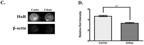 Cytoplasmic abundance of ELAV-L protein 1 (HuR) after 15 min and 1 hr of exposure. (A) Dot blot of HuR and actin (loading control) after 15 min of exposure in cells treated with 25 μg/mL of both, rural and urban organic extracts and 10 μg/mL of DEP organic extract. (B) Densitometric analysis of cytoplasmic HuR dot blots from cells treated with DEP extract. (C) Dot blot of HuR and actin after 1 hr of exposure in cells treated with 25 μg/mL of urban organic extract. (D) Densitometric analysis of HuR dot blots from cells treated with the urban extract. Figure represents the average of three independent experiments (n = 3). Values are expressed as the mean ± SEM (n = 3). ** p ≤0.01, *** p ≤ 0.001 compared to carrier.