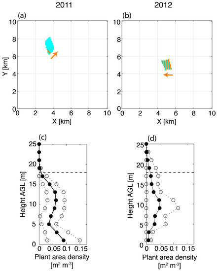 ARPS-CANOPY burn unit schematics (panels a,b) and plant area density profiles (panels c,d) for the 2011 and 2012 cases. In the burn unit schematics, blue shading indicates the ARPS-CANOPY burn unit and orange shading indicates cells where the fire heat source is applied [arbitrary time in figure], with arrows indicating the general direction of simulated fire propagation during each event. In the plant area density profiles, the solid line/filled circles are domain-average values and the dashed line/hollow circles show +/− one standard deviation. The horizontal dashed line denotes 18 m AGL, which is the approximate domain-average height of the simulated canopy. Plant area density is derived from LiDAR measurements [14].